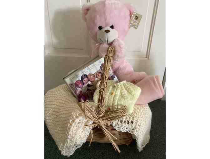 Rattan basket with 48" x 48" cream hand-knit baby blanket by Sue Dailey and hand-knit baby sweater by MHS alum, pink stuffed bear with receiving blanket and Little Big book of Grandmother