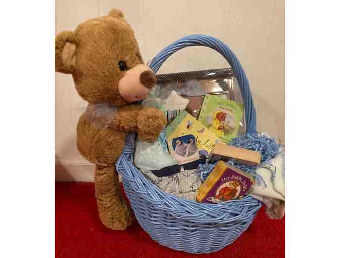 Large blue basket filled with five (5) story books; receiving blanket, sleepwear and a large stuffed teddy bear.