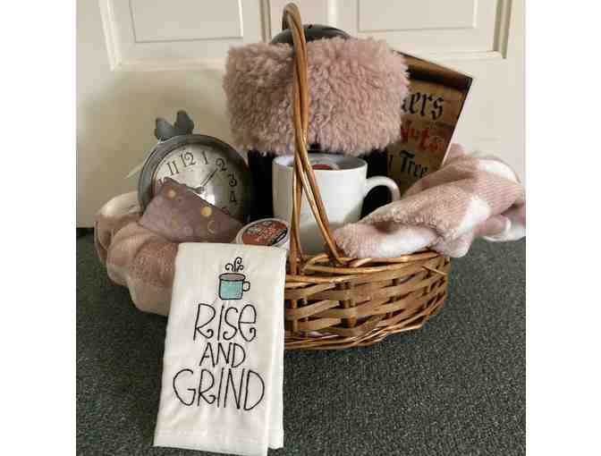 Basket with one-size shawl and night mask, vintage battery clock, Brentwood single cup coffee maker with cup and book