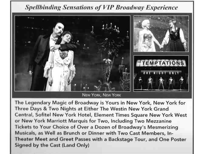 The legendary Magic of Broadway is yours in New York City for 3 days and 2 nights at The Westin New York Grand Central, Sofitel New York Hotel, Element Times Square New York West or New York Marriott Marquis for two, including two (2) mezzanine tickets to your choice of over a dozen of Broadway's mesmerizing musicals, as well as brunch or dinner with two cast members, in-theater "Meet and Greet" with backstage tour, and one poster signed by the cast (Land Only).