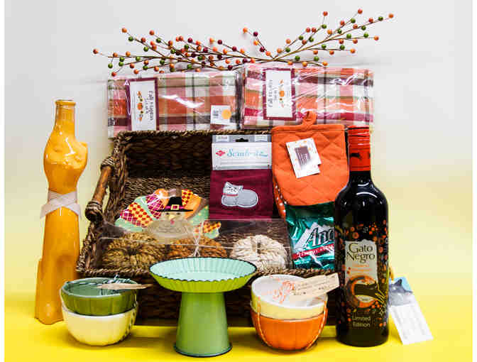 Celebrate the beauty of autumn with 2 bottles of wine and beautiful decorative pieces. 2 bottles Gato Negro wine, Cat Scrub-itz, Orange plaid fall napkins, Mini pie holder, 4 set of small bowls, Turkey candy dish, Andes mints