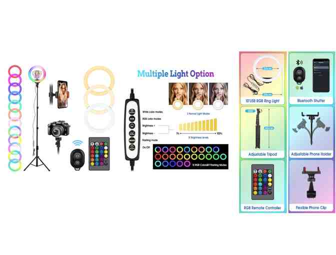 • Includes: 1×10"RGB Ring Light; 1×Infrared Remote Control; 1×Tripod; 1×Bluetooth Remote Control; 1×RGB Remote Control; 1×Mobile Phone Clip; YouTube videos, TikTok, advertising photography and other occasions.