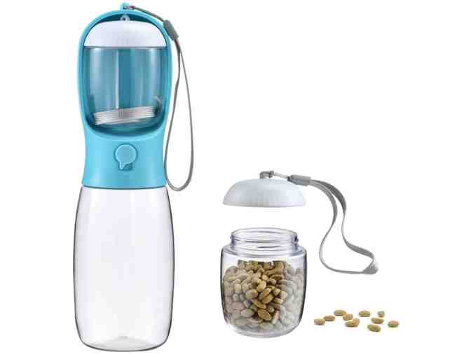- Compare with the common dog water bottle, there is a 100g food container closely attach to the bowl of water bottle. The treat container is detachable with another lanyard. It provides both clean water and fresh food when you go out with your pets.