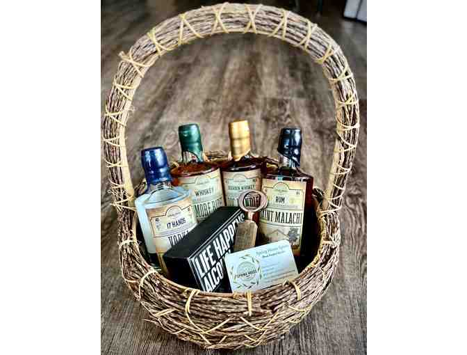 One 375ml bottle each of whiskey, bourbon, rum, and vodka from Spring House Spirits, a local hand crafted distillery located in Chester County. Also includes a fun bar sign and a hand crafted bottle opener made from one of their bourbon wood barrels.