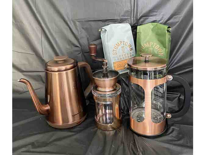 At home coffee lovers, this is for you. Start your morning with freshly ground coffee beans from your coffee mill, use your French Press and electric gooseneck kettel all in bronze to create the perfect cup of coffee!