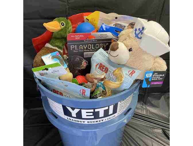 Treat your dogs with a variety of different treats and toys. Including, 2 plush dog toy, two bully springs, scented dog toy, frisbee, and even a 5 gallon yeti bucket.