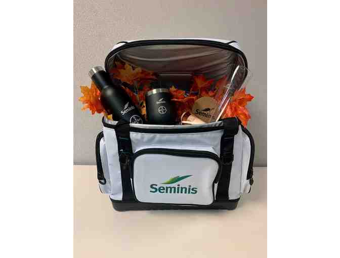 Coleman Cooler with set of glass beer mugs, travel wine cooler set, plus hats and water bottle with vegetable brand logos.