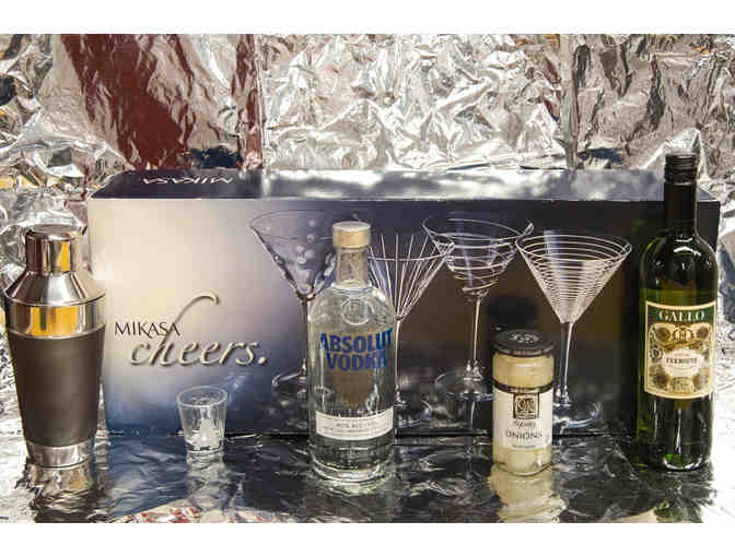 Set of 4 MiKasa martini glass set, 1 bottle Absolute vodka, jar onions, Gallo white vermouth, shot glass, shaker -NO SHIPPING ON THIS ITEM