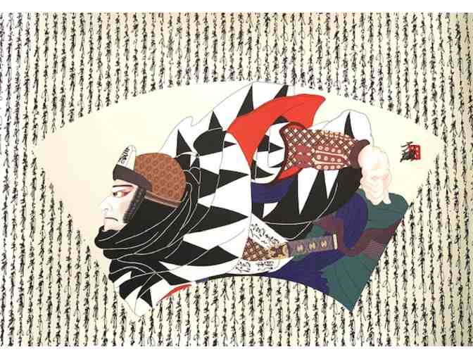 This striking print was created by noted artist Hisashi Otsuka of Honolulu. The artwork is unframed, measures 25" x 17.5" and is 1865/4500. This ukiyo-e style print depicts a determined ronin with swirling dress and a robe with a calligraphy-style pattern. This work evokes bygone times in Japan when masterless ronin made the best of their situation. The red splash enhances this striking image. Hisashi Otsuka's artwork is a powerful balance of ancient Eastern techniques and modern Western ideas. Like a concert musician with perfect pitch, he has perfect color memory and sense. Otsuka's time-honored poets and warriors, kabuki figures, ukiyo-e women, and elegant calligraphy are steeped in the classical past. Yet in color and composition, his work achieves a vigorous, contemporary context. Monumental in scope and meticulous in detail, it offers an aesthetic of heroic and subtle impact.