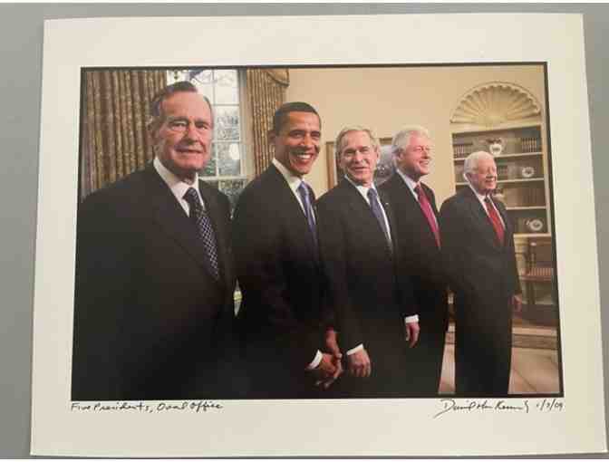 A picture in the Oval Office of five living Presidents captured and signed by renown photographer, David Hume Kennerly.