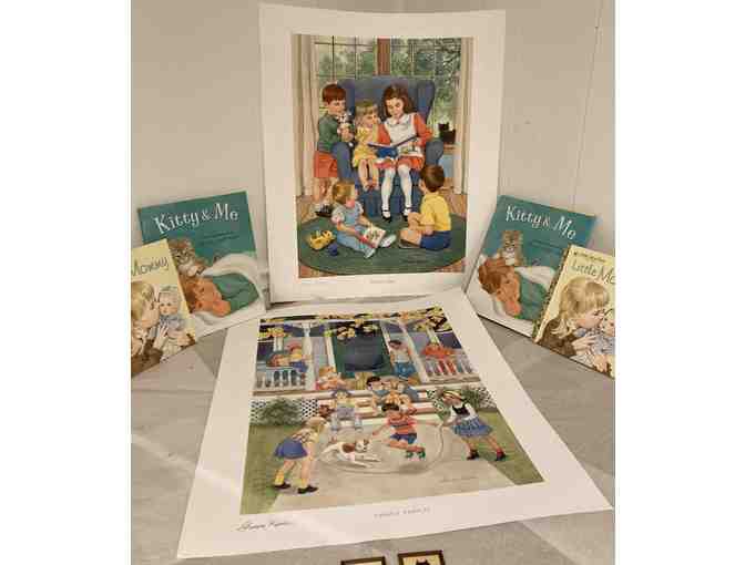 Two sets of Sharon Kane illustrated and signed children's books "Kitty and Me" and " Little Mommy" along with signed illustrations of Story Time and Front Porch.