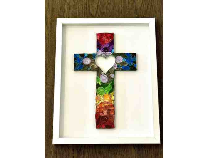 For their project, the Second Grade students created colorful crosses with hearts inside each that are one-of-a-kind and perfectly adorn any area in your home. Using a technique called paper quilling, the students hand rolled strips of vibrantly colored paper and shaped them into swirls, teardrops, and imaginative designs. A dimensional cross was then created by gluing each of these pieces together. The 11in. by 14in. shadow box frame houses each whimsical masterpiece for all to admire.