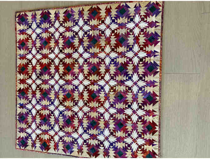 The quilt measures 33 inches by 33 inches and comes with a hanging sleeve for easy attachment to your wall.