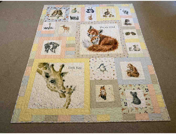 If you look closely at this wonderful quilt, you will also see elephants, giraffes, and lions in the stitched quilting.