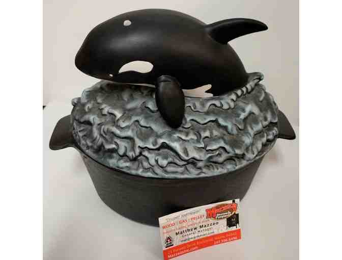 Hand painted porcelain whale sits on an enamel coated, cast iron base.