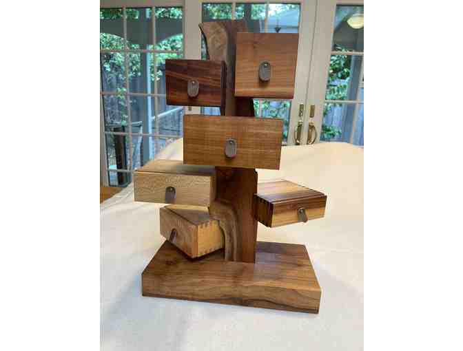 Have you ever seen a Tree Box - well, you're looking at one - a unique and expertly crafted walnut tree (branch) with six individually and expertly built boxes embedded into the tree. The individual boxes from bottom up are made from: