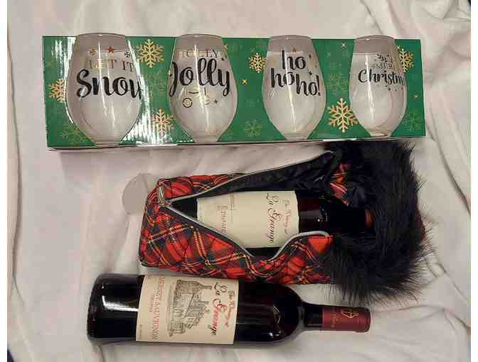 Keep your wine cozy with this cute winter jacket. Includes: 1 bottle LaGrange Cabernet, 1 bottle LaGrange Zinfindel and 4 holiday wine glasses