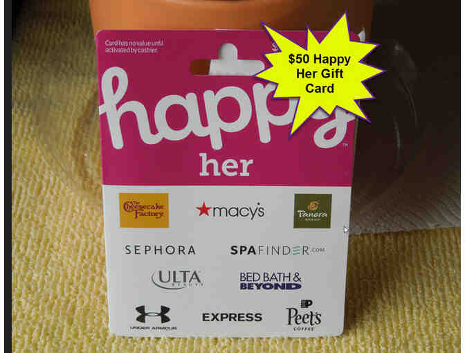 When you give a Happy Her Gift Card, you are really giving ten fabulous gifts, wrapped up in one easy-to-use card. Happy Her Cards can be redeemed at Bed Bath and Beyond for home goods, for sweet treats at The Cheesecake Factory, delicious fare at Paneara dn specialty coffees and teas at Peet's. In addition, she can use it for her favorite apparel at Under Armour, Macy's or Express and beauty products and services at Sephora, Spafinder.com and Ulta. She can also enjoy her card at multiple locations on the same day - or even years apart!