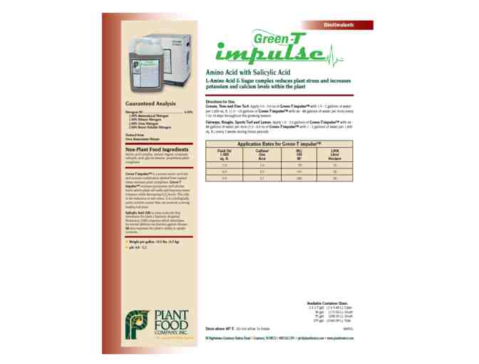 Green-T Impulse is a proven amino acid mix and sucrose combination derived from natural stress resistant plant complexes. Green-T Impulse increases potassium and calcium levels within plant cell walls and improves stress tolerance while decreasing H2O2 levels. This aids in the reduction of wilt stress. It is a biologically active nutrient source that can promote a strong healthy turf plant.