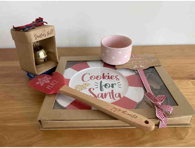 Here's a fun activity set for the young bakers in your family. There is a bright red and white plate that says "Cookies for Santa," along with 3 holiday cookie cutters. These items are BPA-free and stained with non-toxic paint. There is also a red, BPA-free, mitten-shaped silicone spatula with "Peace" and a snowflake on the "mitten" part and "Joy to the World" on the wooden handle. A pink ceramic dish with little white hearts is a great place to store the cookies. And Santa's bell, that can be an ornament on your Christmas tree, is handsomely packaged with a red-and-green plaid bow, and this Tale of Santa's Bell: