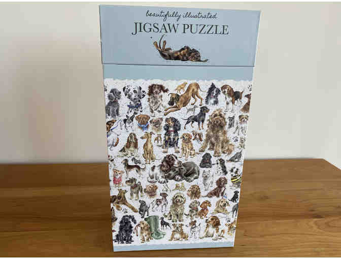"A Dog's Life" is a jigsaw puzzle that illustrates a myriad of dogs of all shapes, sizes and breeds. The dogs look playful and happy as they sit, walk, run, and jump all around the puzzle box.