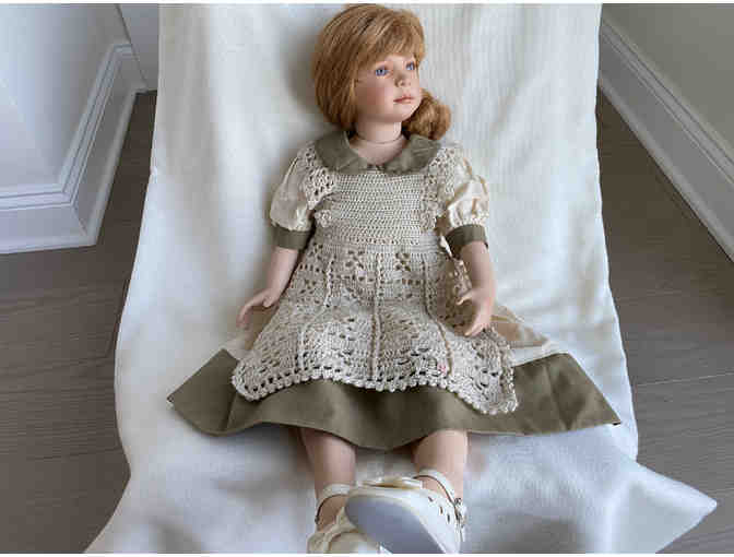 This realistic-looking porcelain doll is a treasure from a bygone era. Her head, torso, arms, hands, legs, and feet are flawless skin-tone porcelain. She has beautiful facial features and red hair that is pulled back in a single braid. She is dressed in a pretty tan and green dress, topped by a knit pinafore. Little white shoes with bows complete her outfit. This doll measures about 26 inches in height.