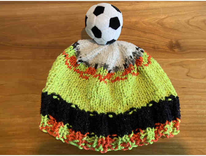Any child would love to have this handmade knit hat with its bright green, orange, and black colors and a soccer ball sitting on top, ready to be headed! The hat will fit children up to four years old.