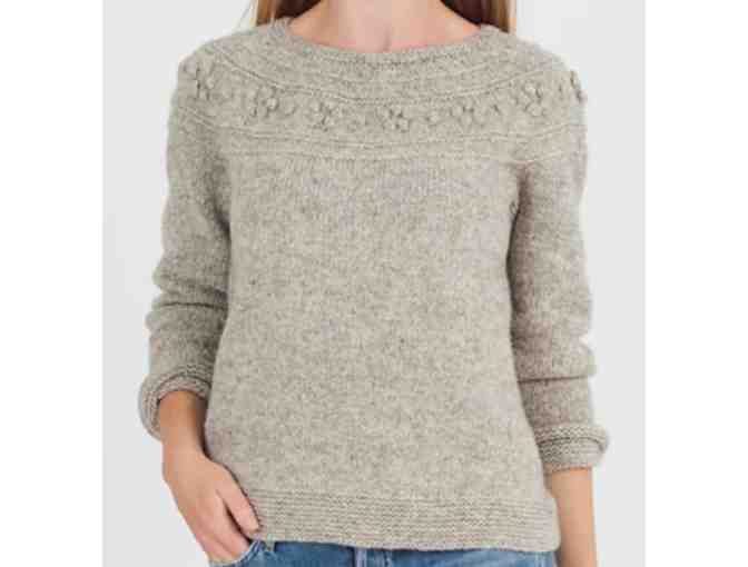 The sweater will be a round-yoked pullover that is worked from the top down, in one piece, and captures the essence of wild roses. The sweetness created created with the bobbles (simulating roses) is toned down with the use of a beautiful rustic tweed yarn in the color Sage, a mix of soft grey/green, blue, and yellow tweed.