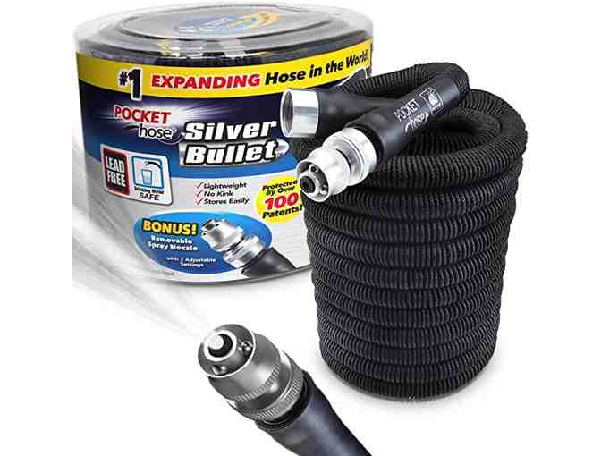 No more lugging a stiff, heavy hose around your lawn! This Silver Bullet hose is super-lightweight and easy to maneuver. It is an expandable garden hose that expands to a full-size water hose when you turn the water on and shrinks back down when you turn the water off. The Silver Bullet coils and can store in a drawer or on a shelf; there is no need to purchase a separate hose reel. The Silver Bullet is durable, too. Its exclusive Bullet Shell outer casing has no seams to tear or burst, so it will not snag, tear, or wear, and the inner tubing is kink-proof.