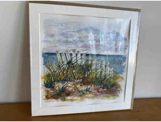 This beautiful painting of a Cape Cod scene was produced through a combination of watercolor and oil pastel on paper. The painting is 12 inches square, and matted, it is 14 inches square. It was completed in 2022 by artist Sarah Connell Campbell of Groton.