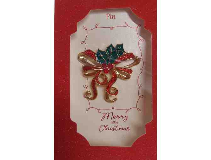 Fancy Red and Gold Bow pin with holly leaves 2" x 2"