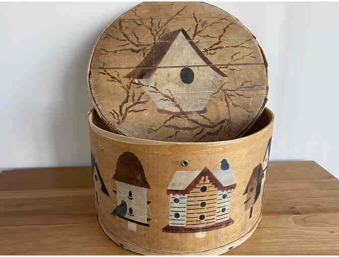 This light-weight wooden box with a removable lid measures 15 inches in diameter and 9 inches high. It is a rustic piece that has lovely paintings of birdhouses of several different types painted all around it. The lid, too, has a painted birdhouse nestled in some tree branches.