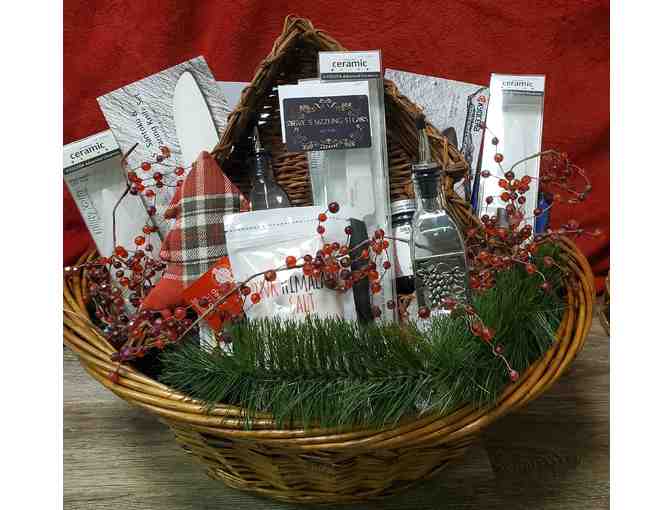 Steak & Knives: Steve's Sizzling Steaks GC $100, 6 different Kyocera knives, oil and vinegar bottles, salt, and fun other filler to complete your evening meal