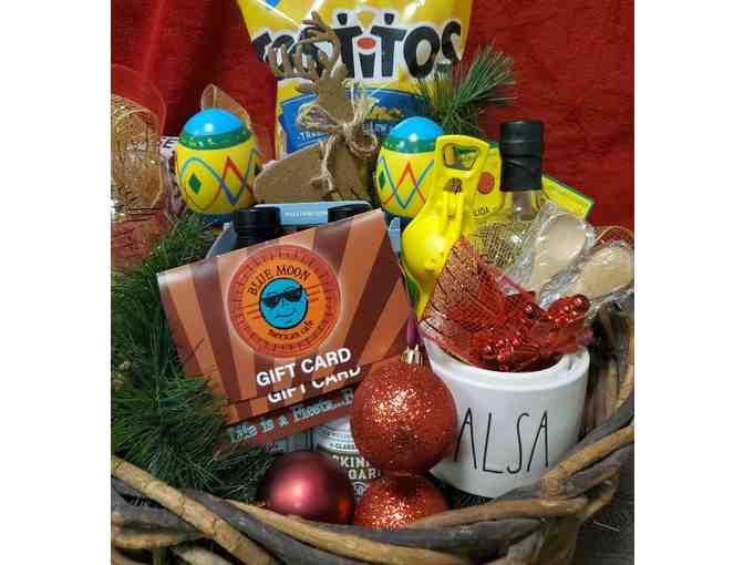 This basket features a Blue Moon Gift Card $50 (multiple locations), Williams Sonoma Skinny Margarita, salsa bowl, tostitos, gourment salt, and few other fun things. Just add tequila to this included NY cocktail infused margarita mix!