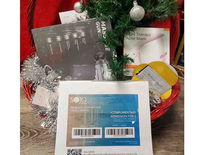 Sojo Spa Package: 2 complimentary admission, massage gun, aromatherapy oil diffuser, light therapy acne mask, Project Body 50 minute Project, cozy socks