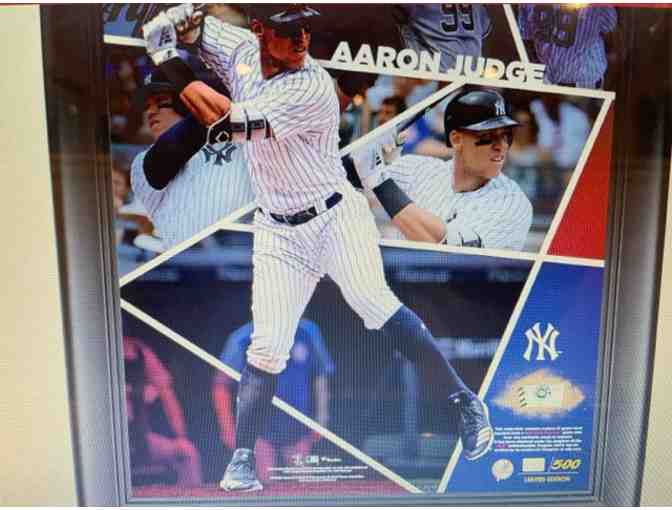 Aaron Judge Framed Collage w/ piece of game used baseball. Limited Edition of 500