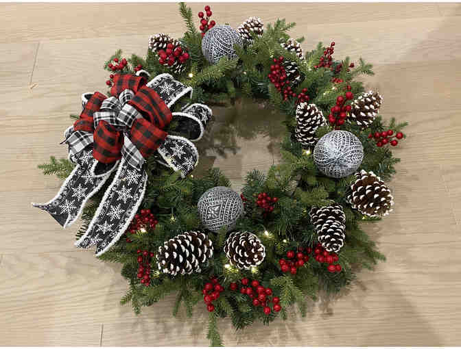 This beautiful, life-like evergreen wreath is large -- 27 inches in diameter -- perfect outside on your home or front door, or inside over your fireplace or on a wall in your living room or den. The wreath is exquisitely embellished with pine needles, snow-covered scotch pine needles, snow-tipped pinecones, lots of red berries, sparkly ornaments, a large bow of three types of decorator ribbon (red and black plaid, black ribbon with white snowflakes, and black and white plaid), and 50 LED lights powered by 3 AA batteries (included).