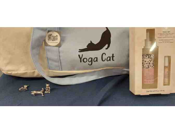 Kitty print child yoga mat, Kitty yoga mat bag, Cat print plush cuddly fleece blanket 60 x 70, 3 pewter cats in yoga poses, yoga mat cleaning spray