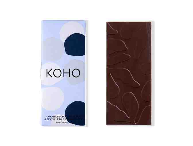 Enjoy ten (10) 2.5oz KOHO Hawaiian Cacao Macadamia Nut & Sea Salt 55% Dark Chocolate bars