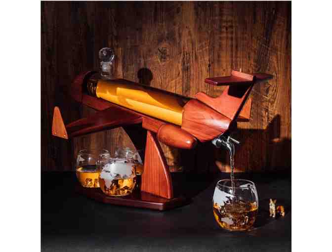 A beautifully handcrafted decanter - a reproduction of a vintage passenger airplane with four 12 oz hand-blown world map glasses! Bid Bid Bid