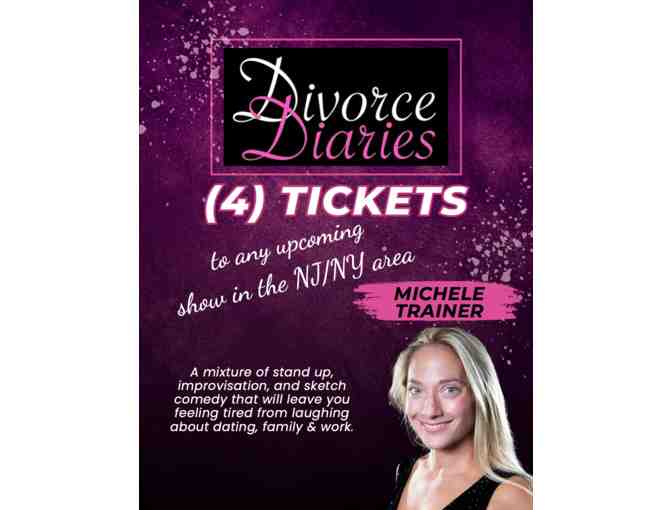 4 tickets to any upcoming show in NY/NJ to Divorce Diaries featuring Michele Trainer. A mixture of stand up, improvisation, and sketch comedy that will leave you feeling tired from laughing about dating, family and work.