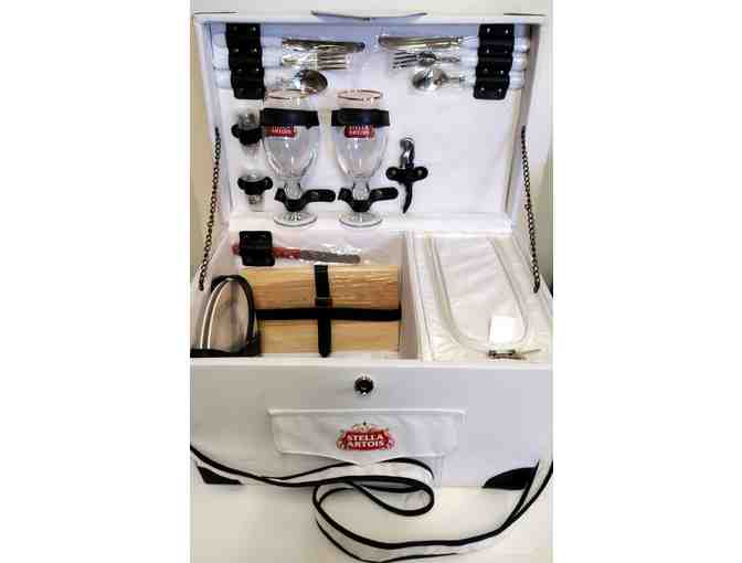 Stella Artois Picnic Cooler containing glasware, silverware and plates