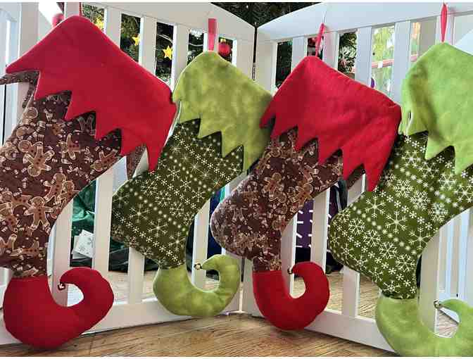 Brighten up your fireplace with these one of a kind, handmade stockings. Stockings are made from cotton flannel and lined with cotton Xmas fabric. The toe is stuffed with a jingle bell sewn onto the toe to alert if anyone is trying to sneak a peek at their stocking goodies. A ribbon loop completes the look to allow for hanging. A perfect gift for more whimiscal Xmas decor! Great for kids.