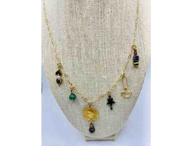 Each charm is one of a kind, created uniquely for this necklace from mixtures of goldfield elements and special natural gems.
