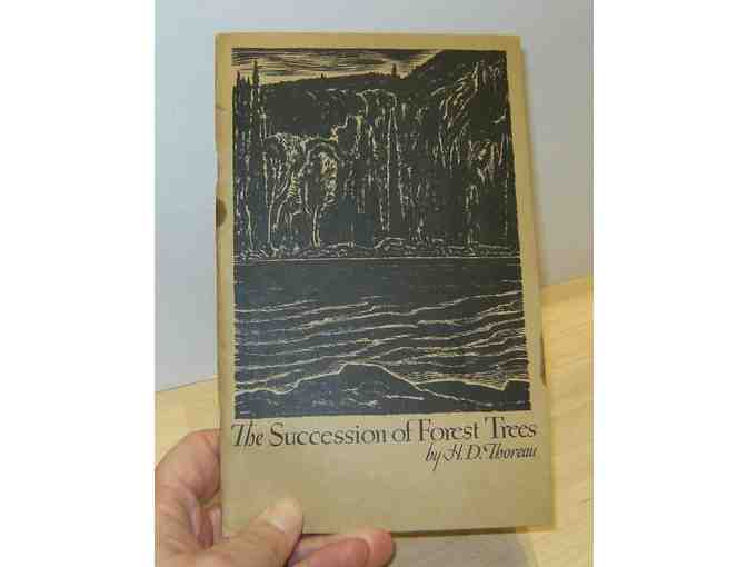 The Succession of Forest Trees. By H. D. Thoreau. An Address Read to the Middlesex Agricultural Society in Concord, Sept. 1860. Reprinted by T. M. [Thoreau MacDonald] 1956. Courtesy of Thoreau's publishers, Houghton, Mifflin Co. 40 pp. stapled pamphlet. Thoreau's essay is reprinted here, with woodcut illustrations by Canadian graphic artist, Thoreau MacDonald (1901-1989), son of J. E. H. MacDonald (1873-1932), one of Canada's Group of Seven Artists. Cover has small soiling at stapled edge. Otherwise, this pamphlet is in good condition. The two Thoreaus, all in one place!