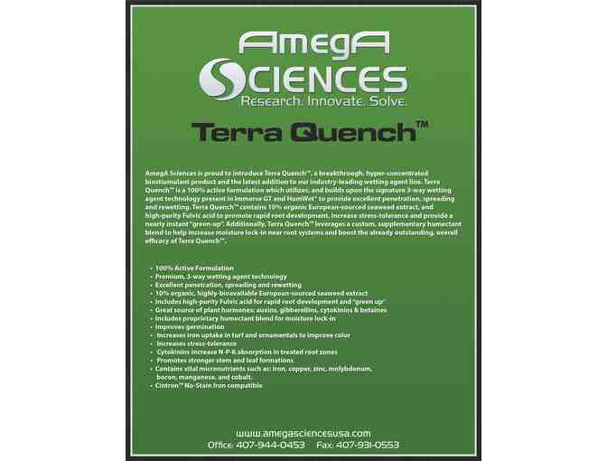 AmegA Sciences is proud to introduce Terra Quench, a breakthrough, ultra-concentrated biostimulant product and the latest addition to our industry-leading wetting agent line. Terra Quench is a 100% active formulation that utilizes and builds upon the signature 3-way wetting agent technology present in Immerse GT and HumWet to provide excellent penetration, spreading, and rewetting. Terra Quench contains 10% organic European-sourced seaweed extract, and high-purity Fulvic acid to promote rapid root development, increase stress tolerance and provide a nearly instant “green-up”. Additionally, Terra Quench leverages a custom, supplementary humectant blend to help increase moisture lock-in near root systems and boost the already outstanding, overall efficacy of Terra Quench.
