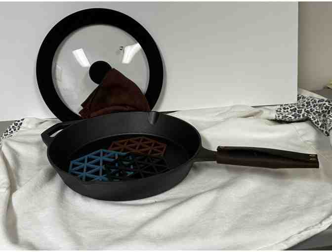 Beautiful 12-inch cast iron skillet with glass lid, three trivets, and leather cover for the handle to prevent burns.