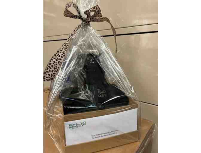 You'll find in this "Safari basket" a photo storage box filled with Gorilla plush; a black Guy Harvey ceramic mug; an olive Guy Harvey t-shirt; a blue Busch Gardens beverage tumbler w/ straw; a black Busch Gardens baseball hat; AND 4 Busch Gardens single day admission tickets including a certificate for a Serengeti Safari Tour for 4.