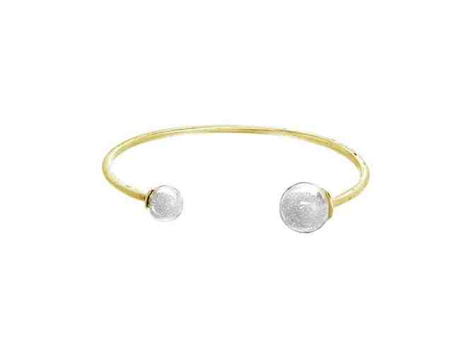 Let yourself be drawn into a miniature world of luminous colors and dynamic movement. A playful and dynamic design, each hand blown glass globe is filled with tiny glass beads and faceted white crystals and the bracelet is completed with a softly textured branch-like cuff. Handmade in Hawaii.