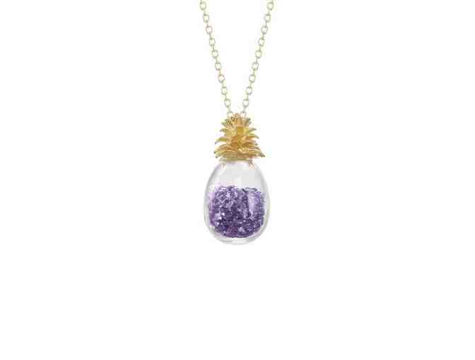 Alive with vibrant color and dynamic movement, this tiny pineapple has big personality. A must-have for a trip to the islands or for elevating an everyday outfit to an eye-catching ensemble. Choose from a varied palette of free-floating colored crystals or amethyst. The hollow glass chamber is vertically held by a delicate piece of organically styled 18K gold vermeil.
